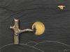 Eine freistehende, dicke, schon abgestorbene Eiche in einer hügeligen Landschaft. Hoch am Himmel fliegt ein einsamer Rabe. Auf dem weit ausladenden Ast sitzt ein Artgenosse und sinniert in Richtung der aufgehenden Sonne.
